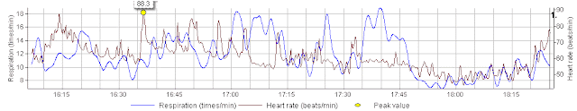 Here is a fragment of the GoWear sleep trace from November 22nd. Restorative Yoga and the meditation session went from 4:00 to 6:15 PM. GoWear shows me as active during the entire Yoga session, which ran from 4:00 to 5:30 PM, then lying down from 5:30 to about 5:45 (the light Grey region), at 5:45 GoWear sees me going into a sleep state (the dark region) before I got up and went home. I was by no means asleep between 5:45 and 6:15, but I was in a different state. I had mentioned FirstBeat Athlete’s implementation of algorithms that infer breathing rates from HRV data. The next FirstBeat trace shows my heart rate and inferred respiration for the combined restorative Yoga and Meditation session for the evening. You can see that around 5:45 PM my heart rate and breathing lowered and synchronized with each other. Some of the guidance during a meditation session is a gentle urging to open the heart and connect it to the breath and apparently that happened. But why did the data register as sleep? Was there something