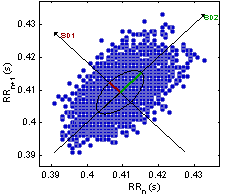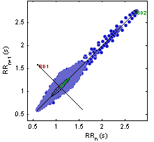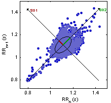 The figure in blue at the very bottom is the Poincare plot. One forms pairs [RR(n), RR(n+1)] where RR(n) is the n-th recorded RR interval and marks these points on a two axis graph to form this chart. The Poincare plot of an unvarying transplanted heart would simply be a point. Beat to beat variations of a normal heart smears the points in a circular shape. Exertion that lasts for minutes induces a steady lowering of the RR intervals and the Poincare plot turns elliptical. One can read off the beat to beat variation from the minor axis (SD1) and the longer term variation from the major axis (SD2) of an ellipse inscribed within the cloud.